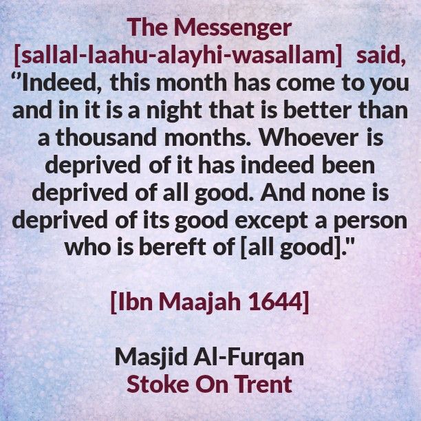 The Messenger [sallal-laahu-alayhi-wasallam] said, ‘’Indeed, this month has come to you and in it is a night that is better than a thousand months. Whoever is deprived of it has indeed been deprived of all good. And none is deprived of its good except a person who is bereft of [all good]. [Ibn Maajah 1644]