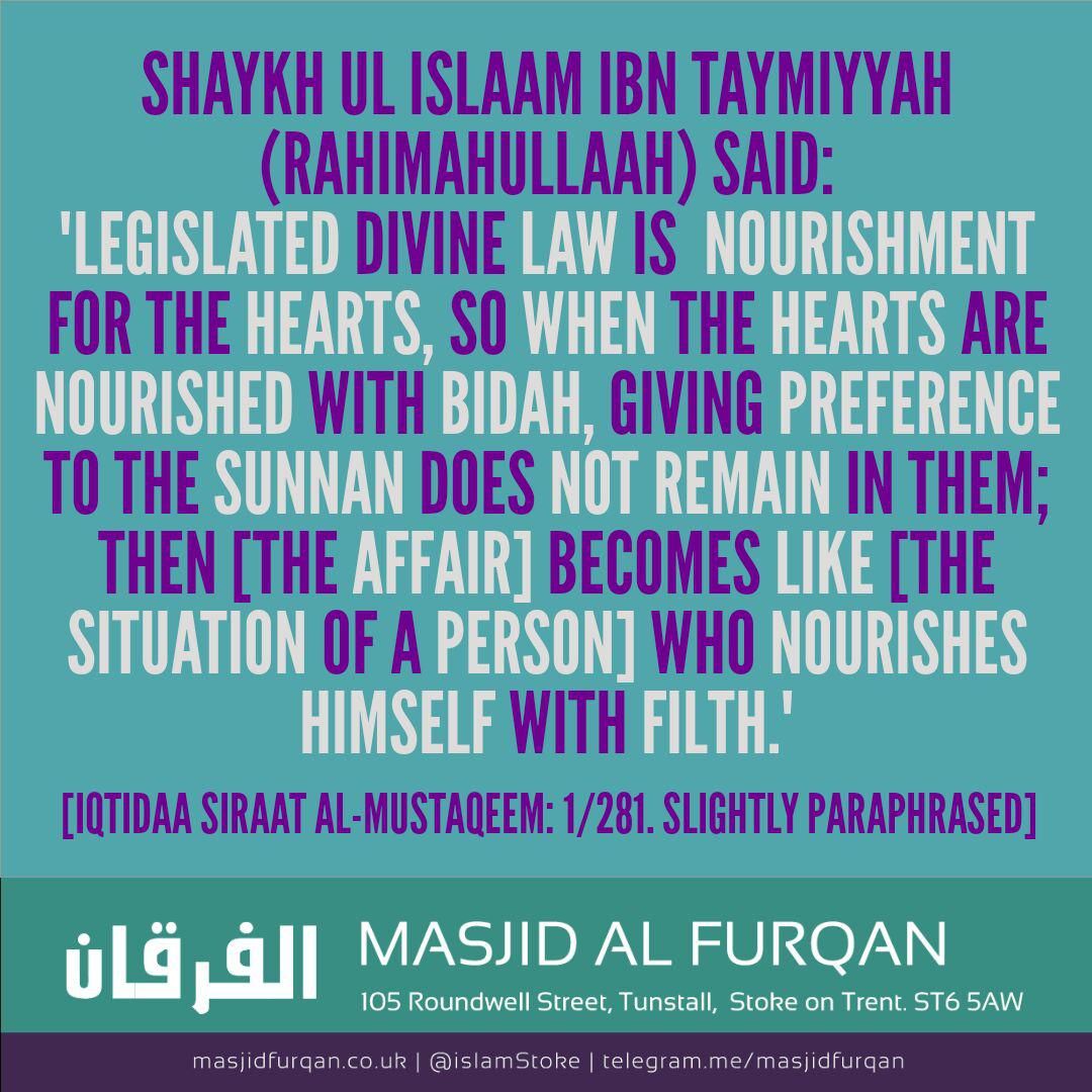 Shaikhul Islaam Ibn Taymiyyah [rahimahullaah] said: The legislated divine law is nourishment for the hearts, so when the hearts are nourished with bidah, giving preference to the Sunnan does not remain in them; then [the affair] becomes like [the situation of a person] who nourishes himself with filth. [Iqtidaa Siraat Al-Mustaqeem: 1/281. Slightly paraphrased]