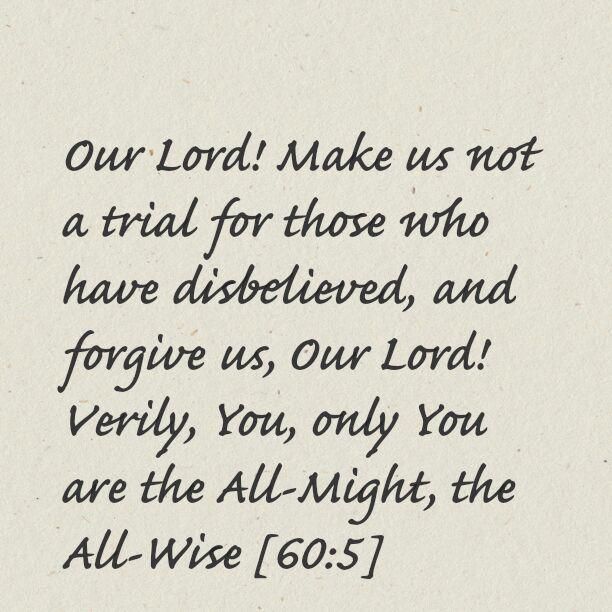 In The Name of Allaah, The Most Merciful, The Bestower of Mercy رَبَّنَا لَا تَجْعَلْنَا فِتْنَةً لِّلَّذِينَ كَفَرُوا وَاغْفِرْ لَنَا رَبَّنَا ۖ إِنَّكَ أَنتَ الْعَزِيزُ الْحَكِيمُ “Our Lord! Make us not a trial for those who have disbelieved, and forgive us, Our Lord! Verily, You, only You are the All-Mighty, the All-Wise.” [60:5] Az-Zujaaj [rahimahullaah] […]