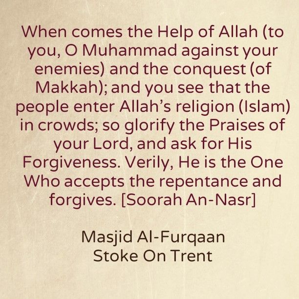 In The Name of Allaah, The Most Merciful, The Bestower of Mercy Allaah (The Most High) said: إِذَا جَاءَ نَصْرُ اللَّهِ وَالْفَتْحُ وَرَأَيْتَ النَّاسَ يَدْخُلُونَ فِي دِينِ اللَّهِ أَفْوَاجًا فَسَبِّحْ بِحَمْدِ رَبِّكَ وَاسْتَغْفِرْهُ إِنَّهُ كَانَ تَوَّابًا When comes the Help of Allah (to you, O Muhammad against your enemies) and the conquest (of Makkah); and […]